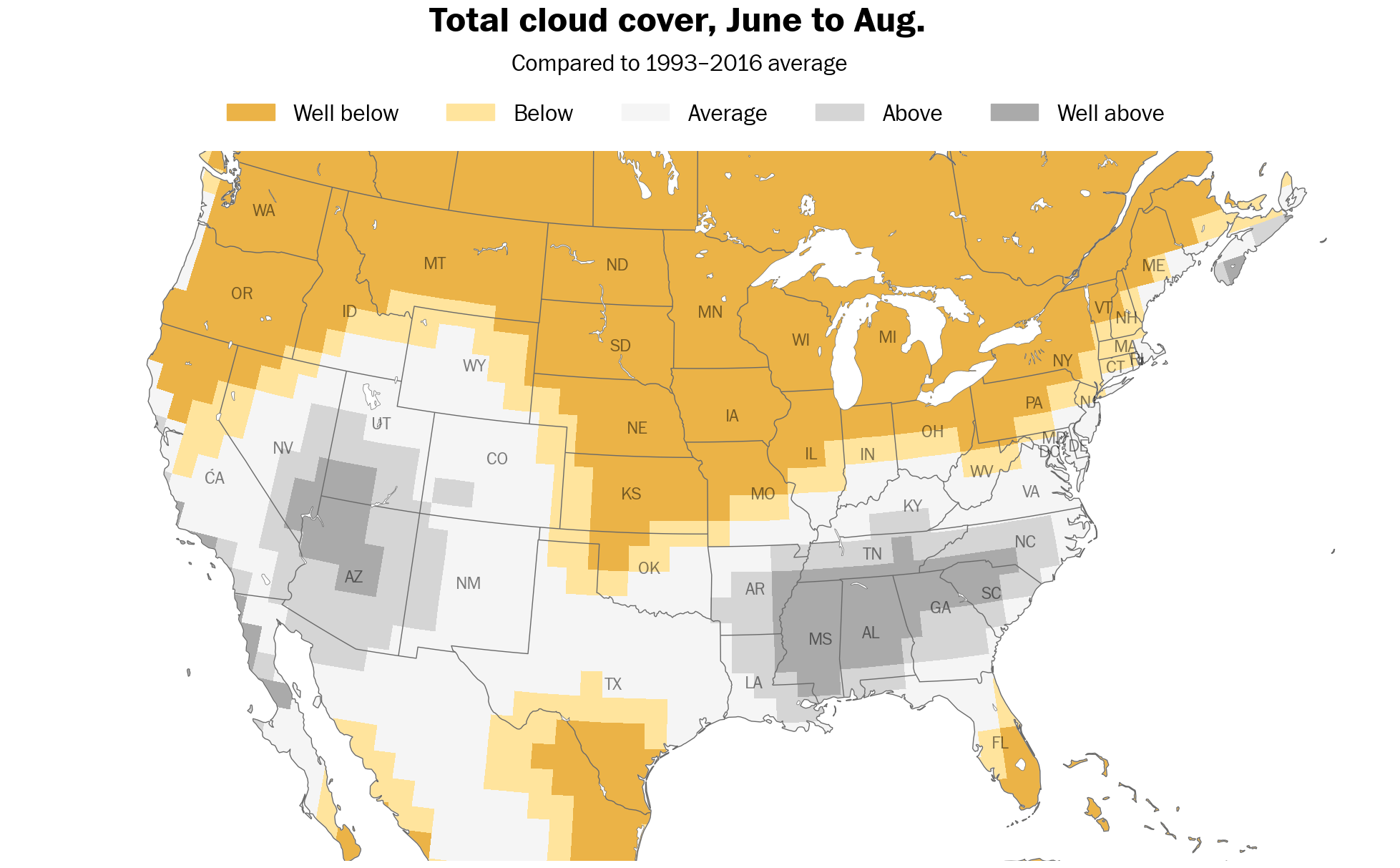 Below normal cloud cover is predicted across the northern tier of states, including New York — perfect for some trips to the beach.