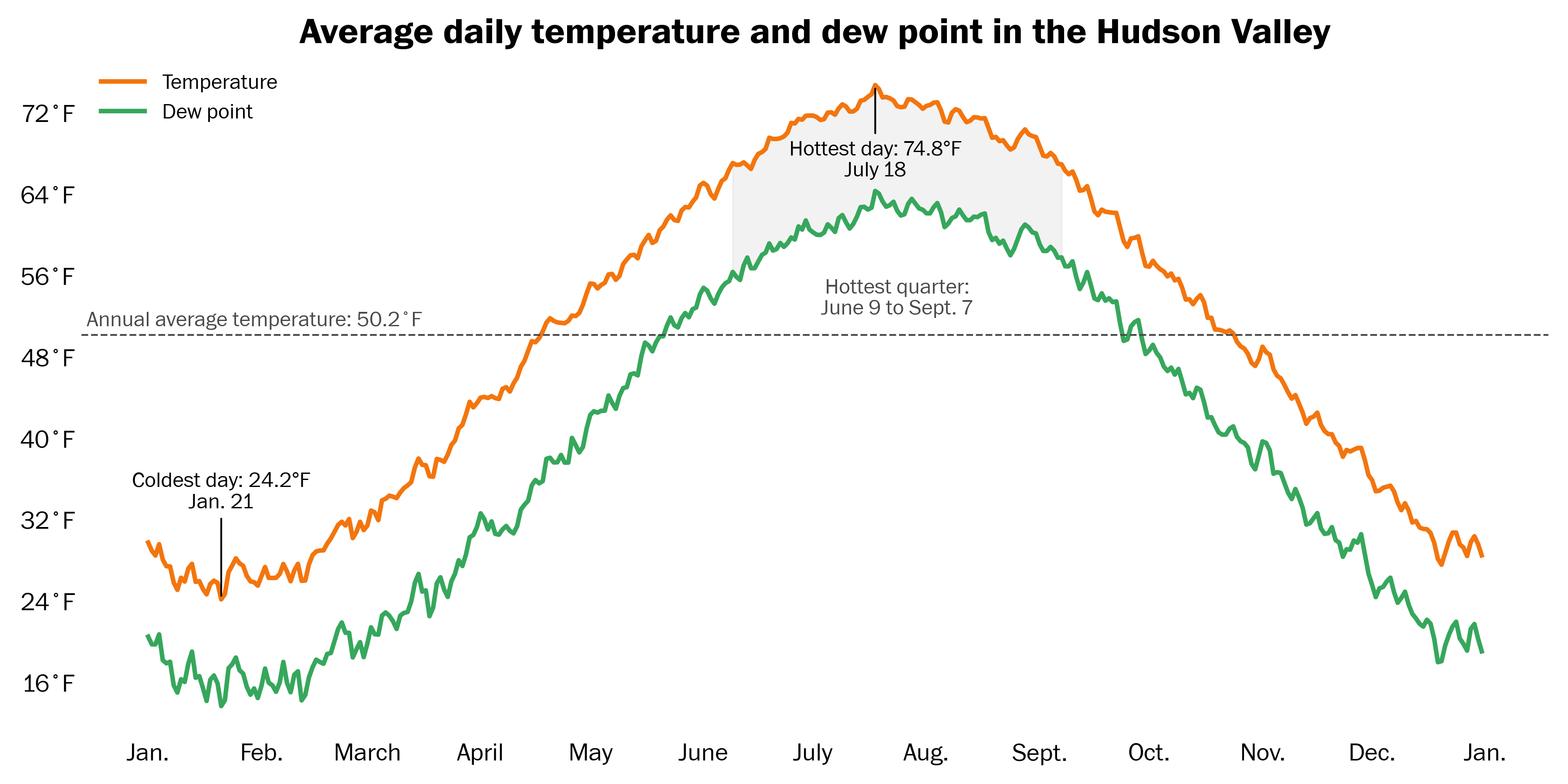 Then there’s Mother Nature’s date — based on the average warmest quarter (91-day period) of the year. In the Hudson Valley, that runs from June 9 to Sept. 7. The most humid quarter of the year lags slightly behind and runs from June 12 to Sept. 10.
