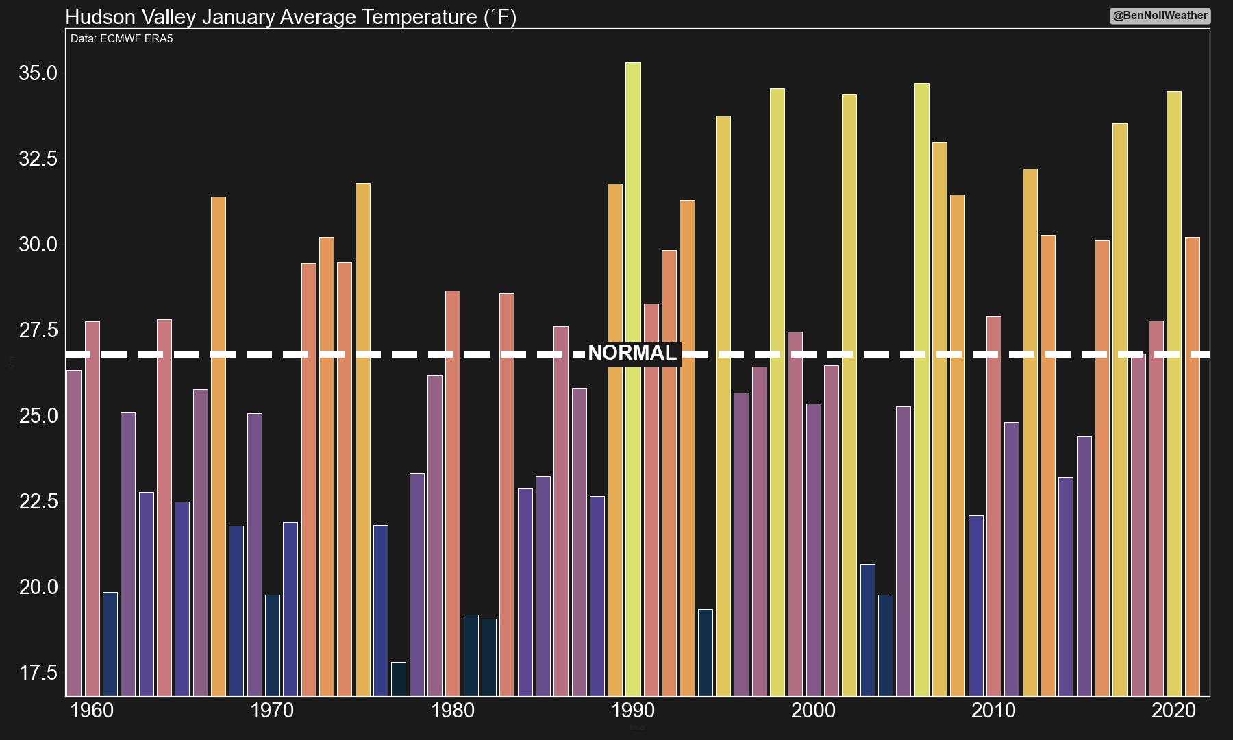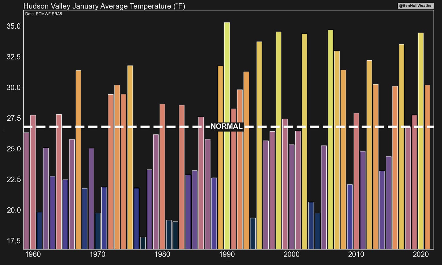 With a long-term average temperature of about 27 degrees, January is the coldest month of the year in the Hudson Valley.