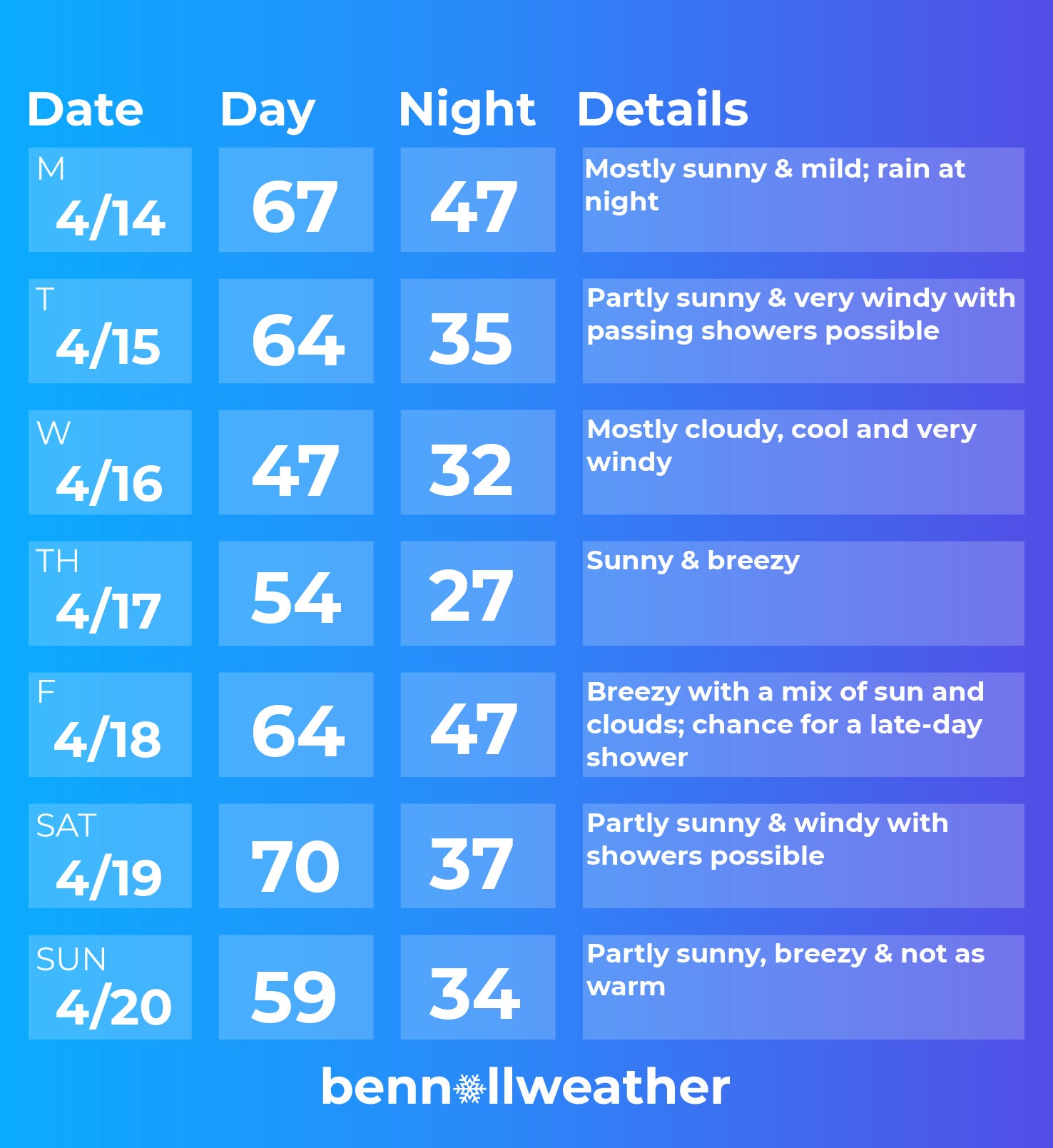 The week will start with mild conditions on Monday. Then it will get windy and cool off, with a freeze on Thursday morning. Then it will get warmer on Friday and Saturday. Then it will get cool again after that 🎢