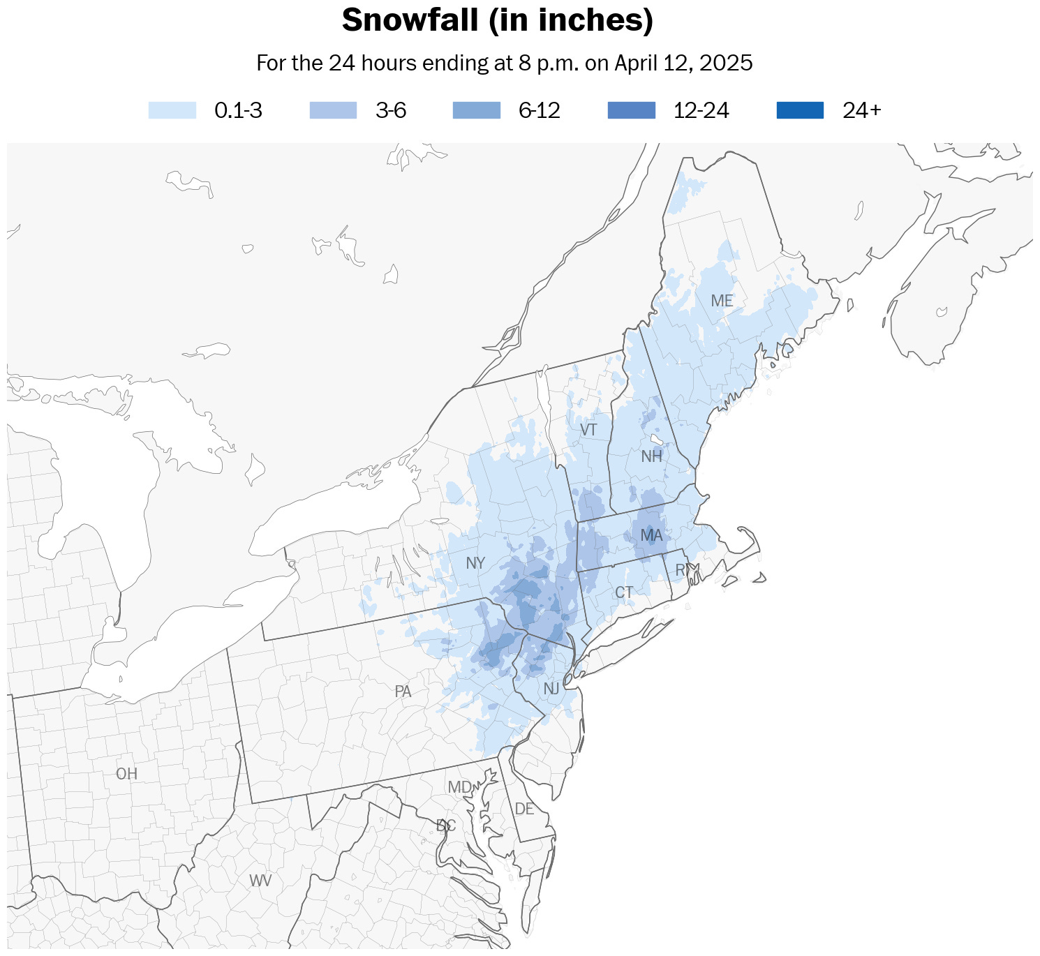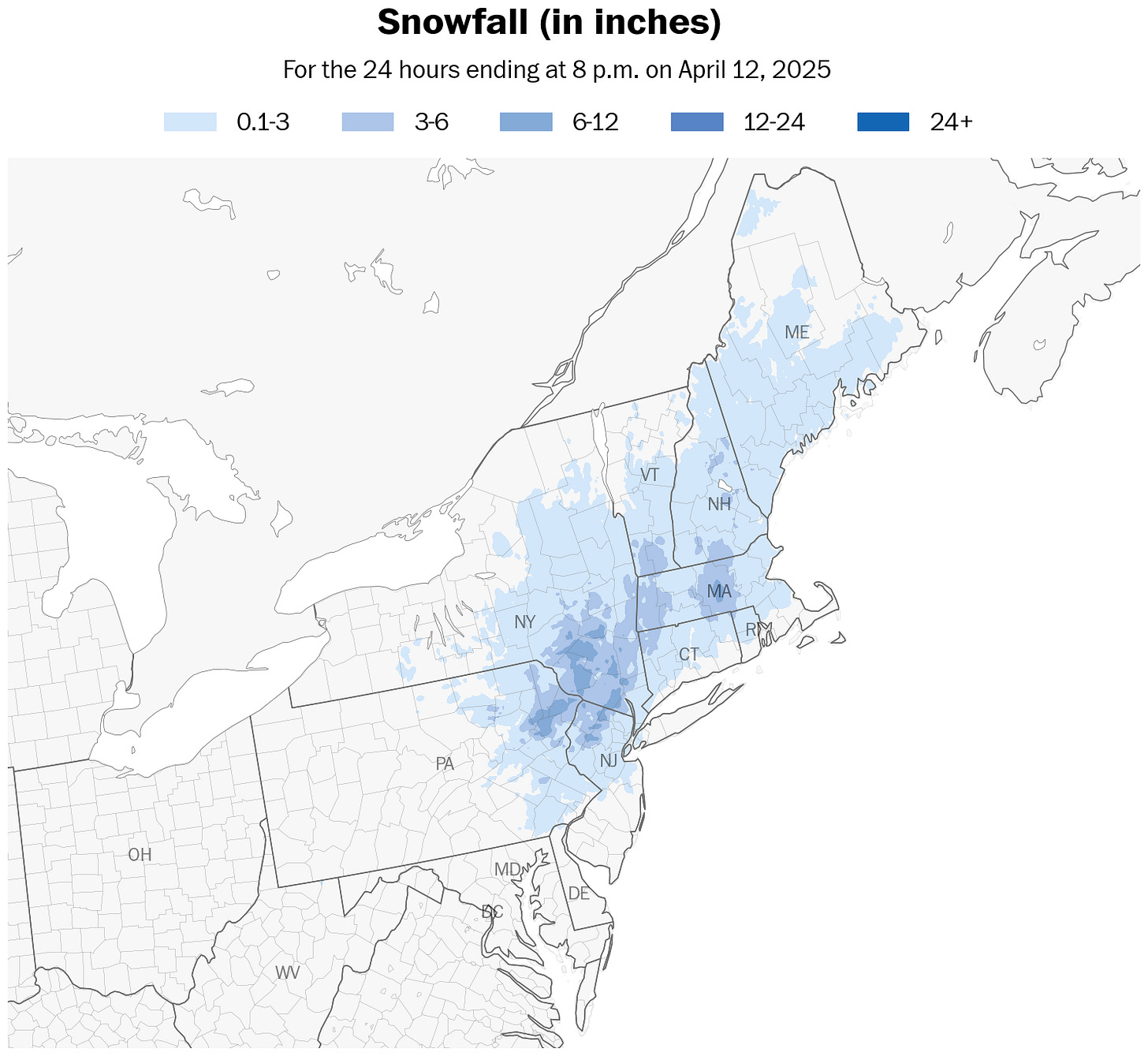The average date of the region’s last snowfall has been steadily getting earlier, happening in early March on average, so a plowable snowfall event on April 12 is a real anomaly.