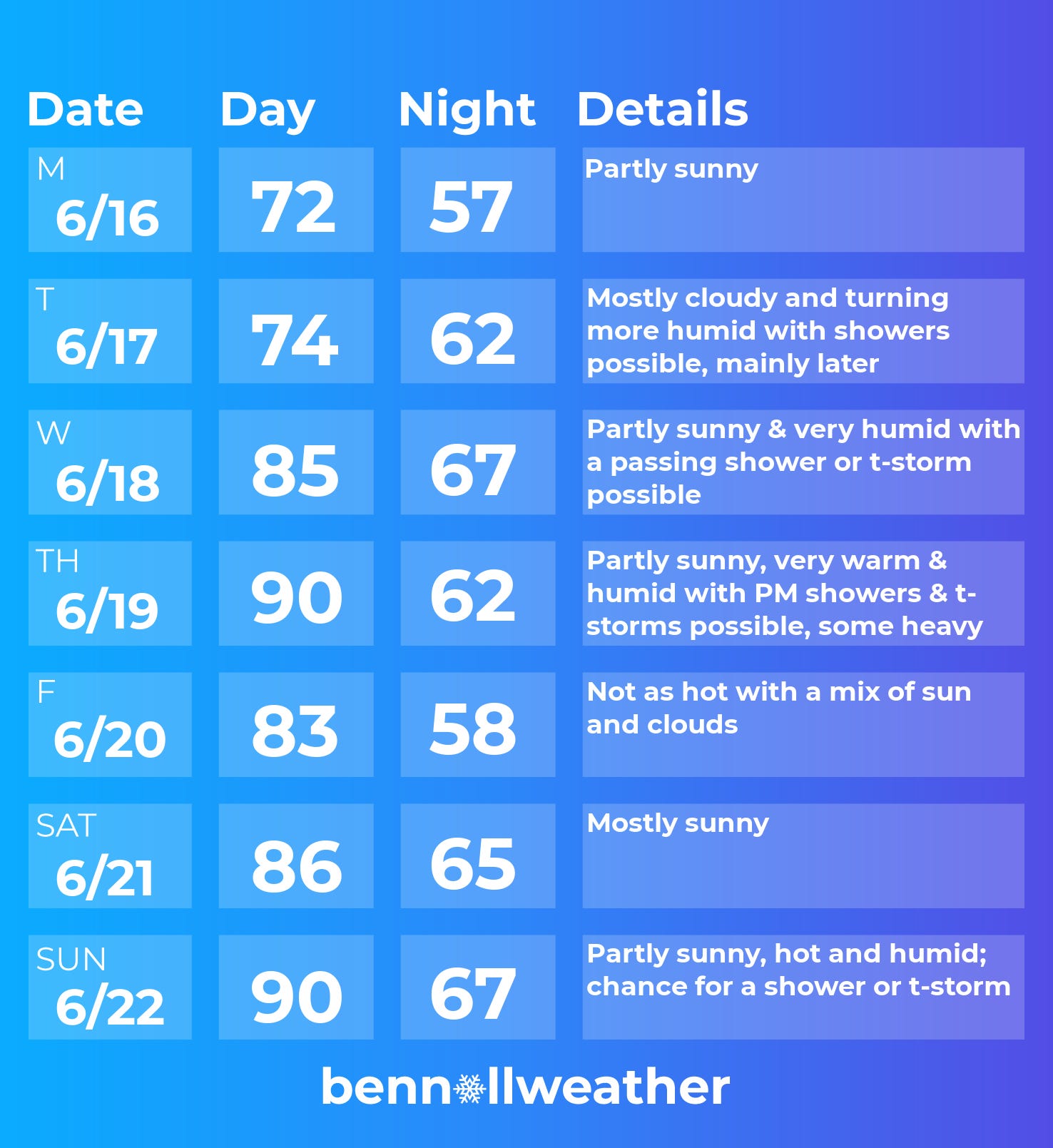 The week ahead will grow hotter and more humid with a few chances for showers and thunderstorms.