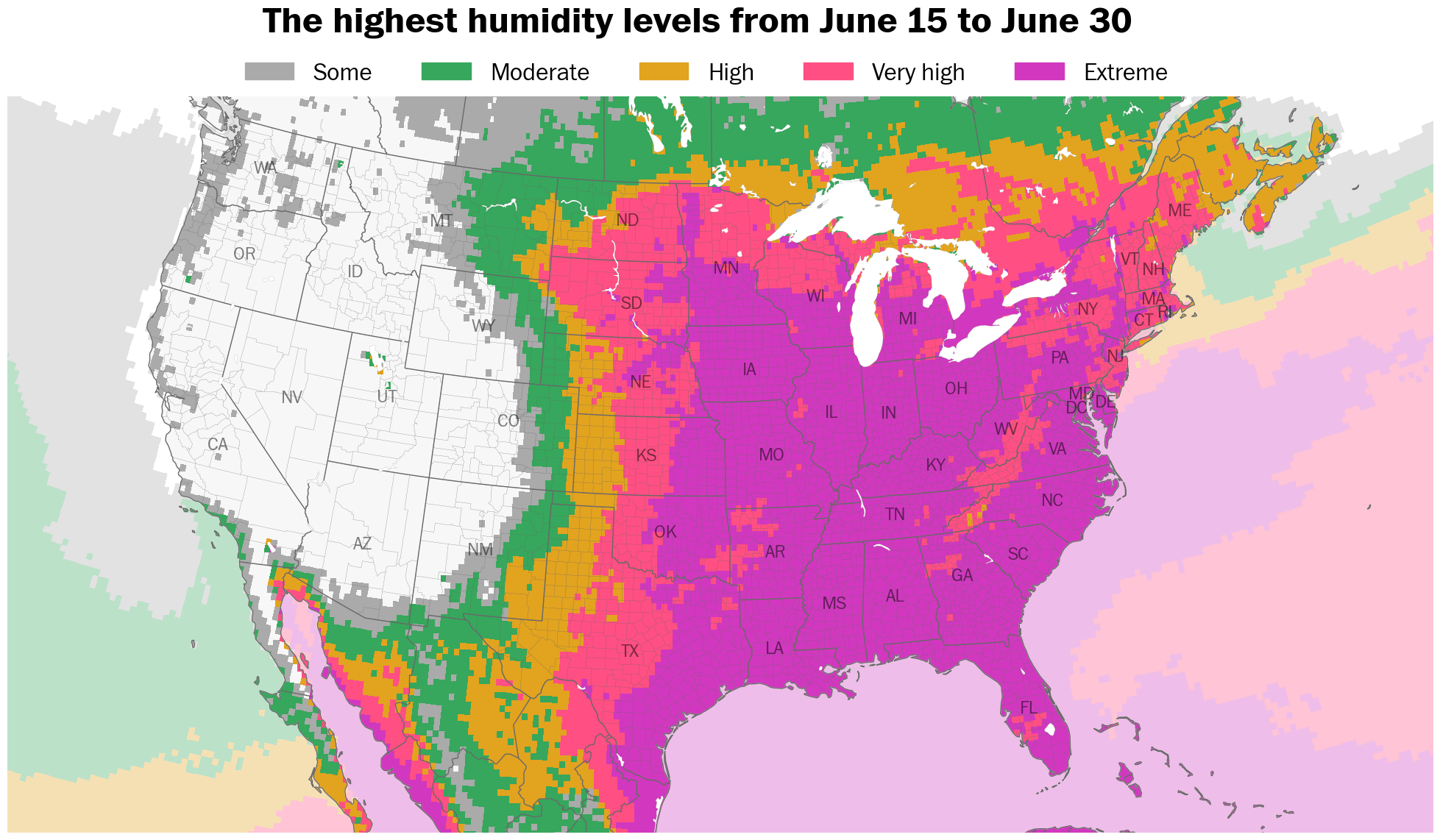 The below map shows the highest humidity category expected over the next two weeks. In the Hudson Valley, it will reach “extreme” — but probably not until next week.