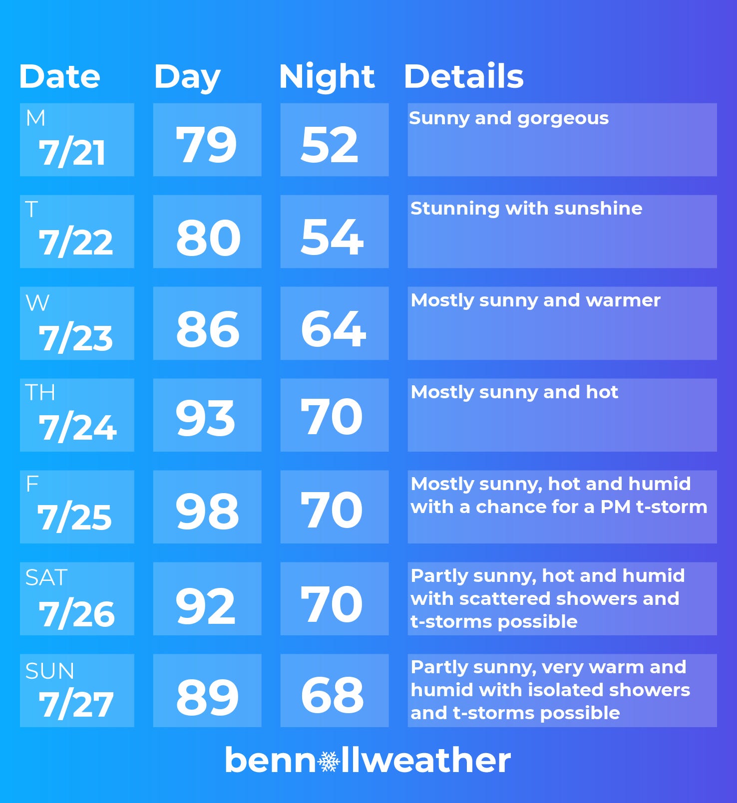 Looking ahead to the week of July 28, conditions look seasonably hot and humid with passing storms to start, followed by a possible cool down around the start of August.