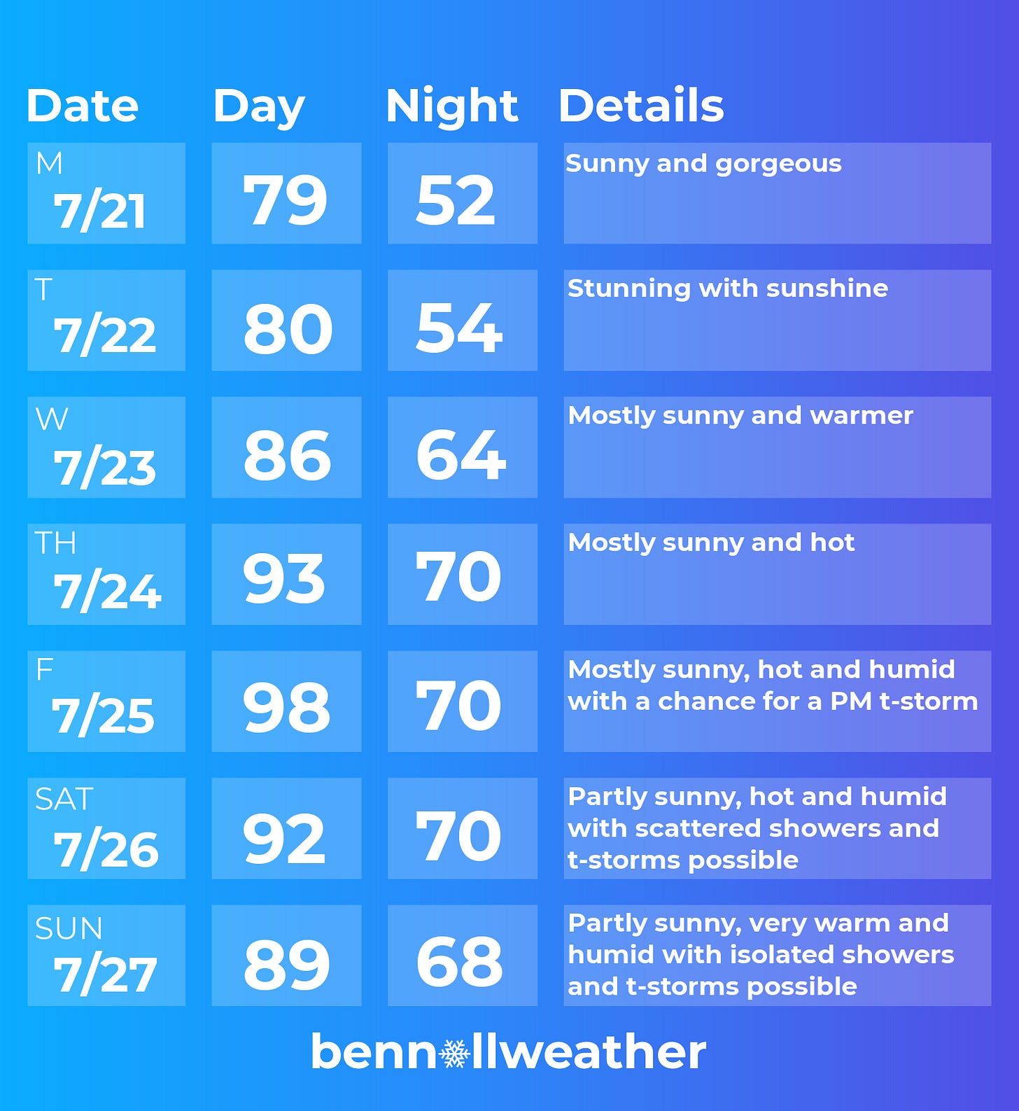 The week ahead will start on a stunning note but turn hot and humid with some showers and storms likely later.