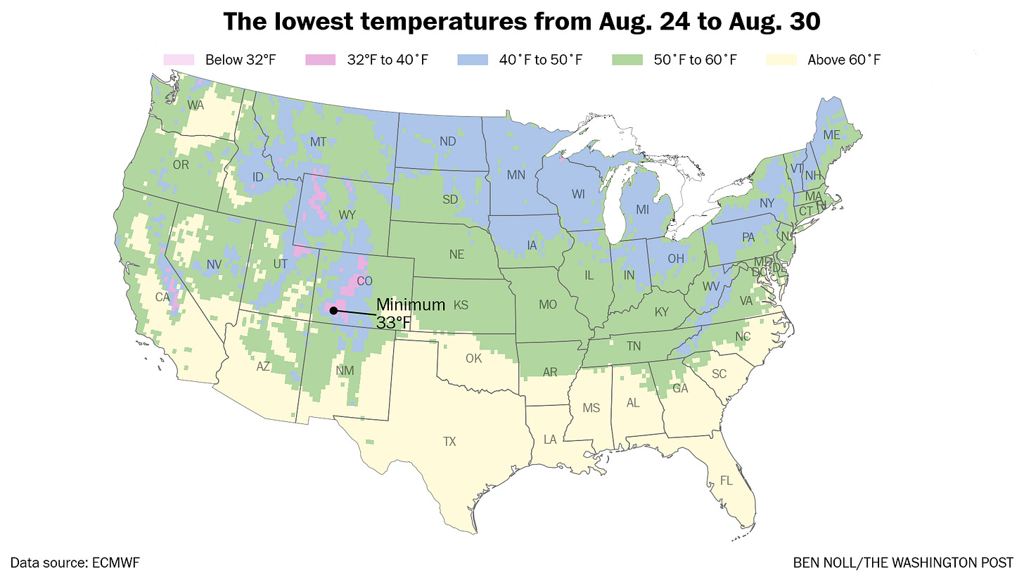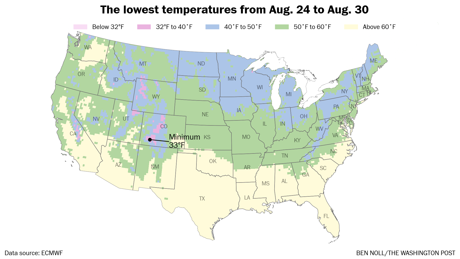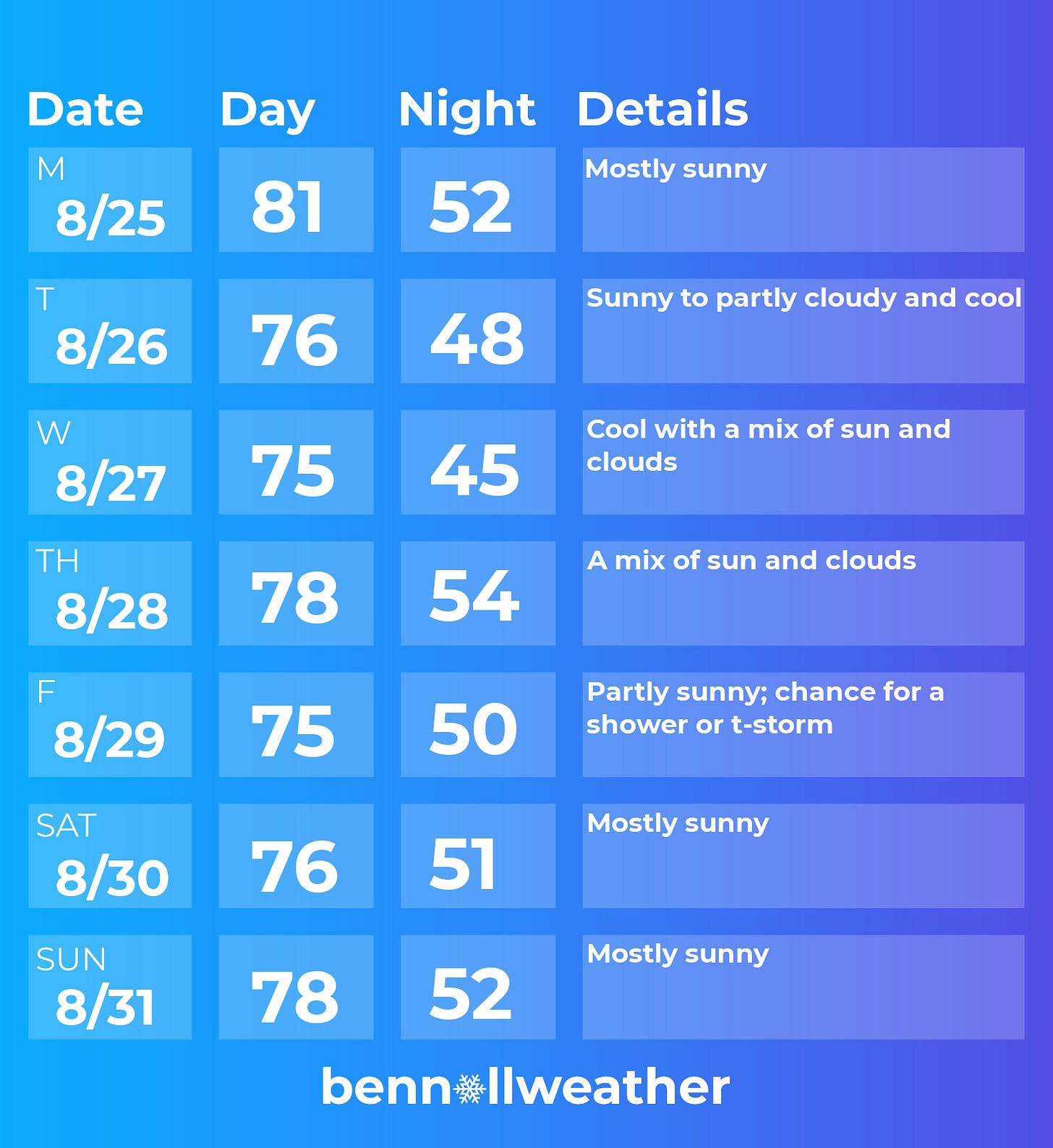 The cool air will last most of the week and come with largely dry conditions. Nighttime temperatures will dip into the 40s — more typical of late September.