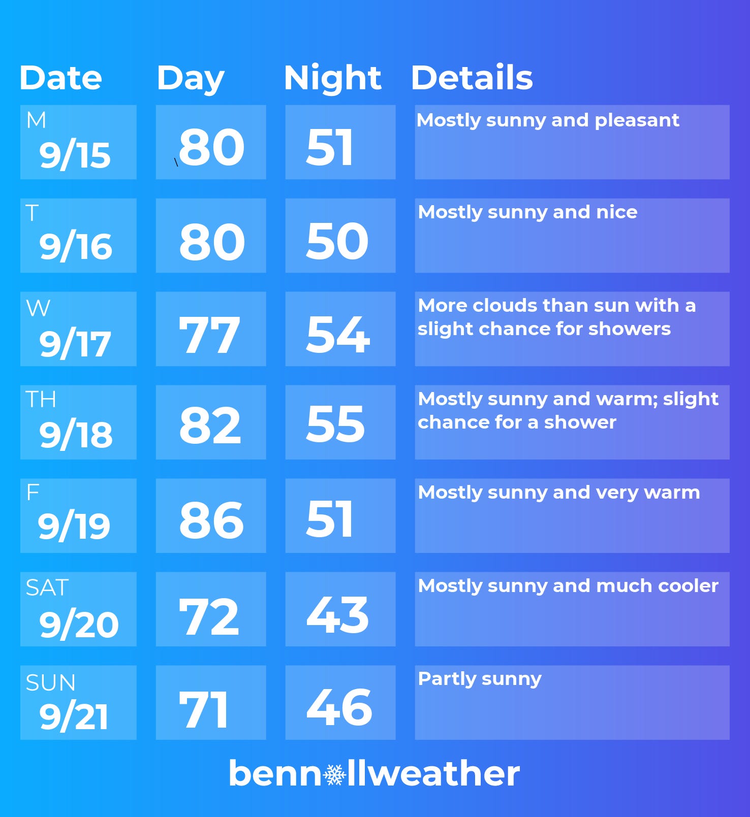 Conditions look to warm up and maybe even turn more humid during the week of September 22, along with some chances for showers or rain.