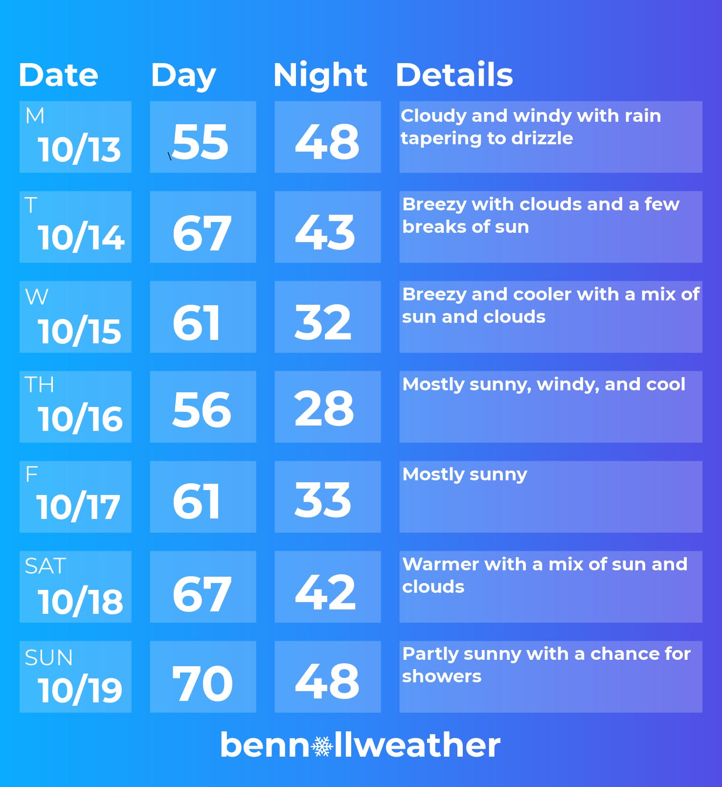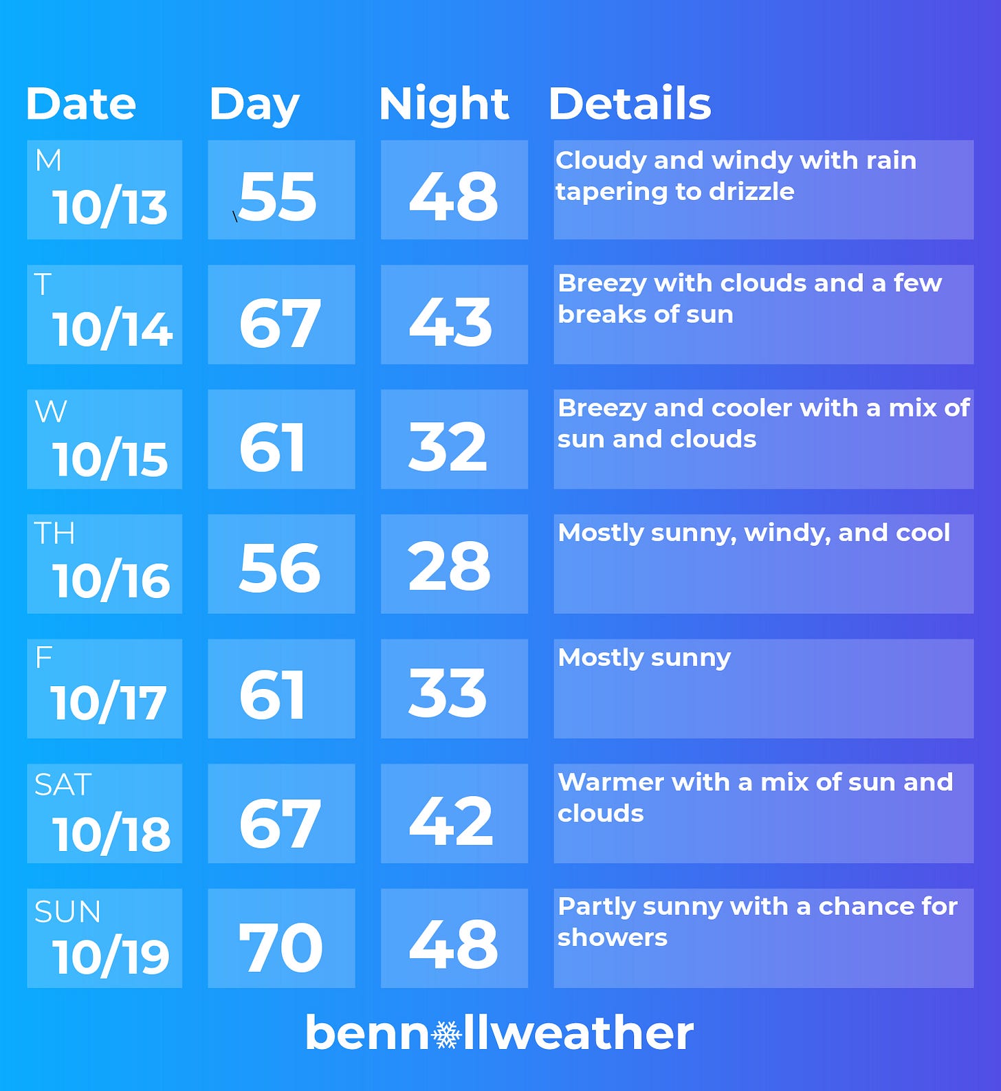 Looking ahead to the week of October 20, conditions may be mild to start followed by a cool down with occasional rain chances. Because of a strong jet stream over the country, winds could be elevated again.