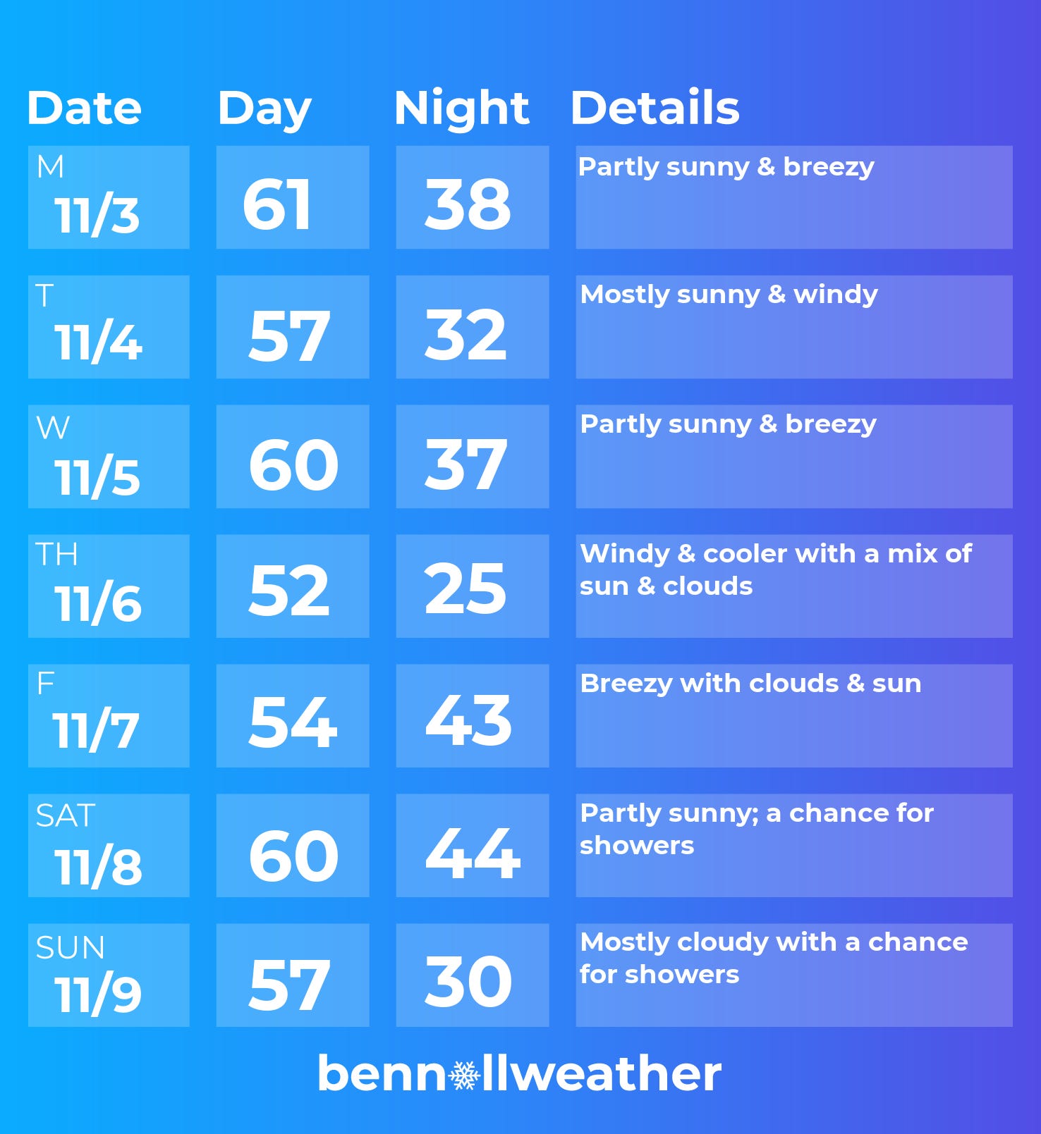 Following a potent cold front, Thursday looks like it will be the coolest, gustiest day followed by a frosty night.