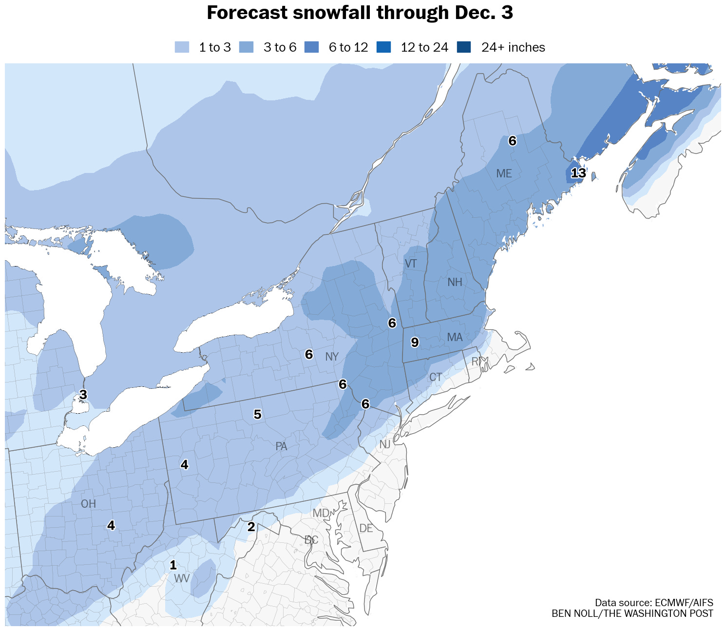 Amounts: Snow amounts of 3 to 6 inches are expected for most places. Whether accumulation ends up on the low-end or high-end of that range in your town depends on how far north the rain-snow line advances.