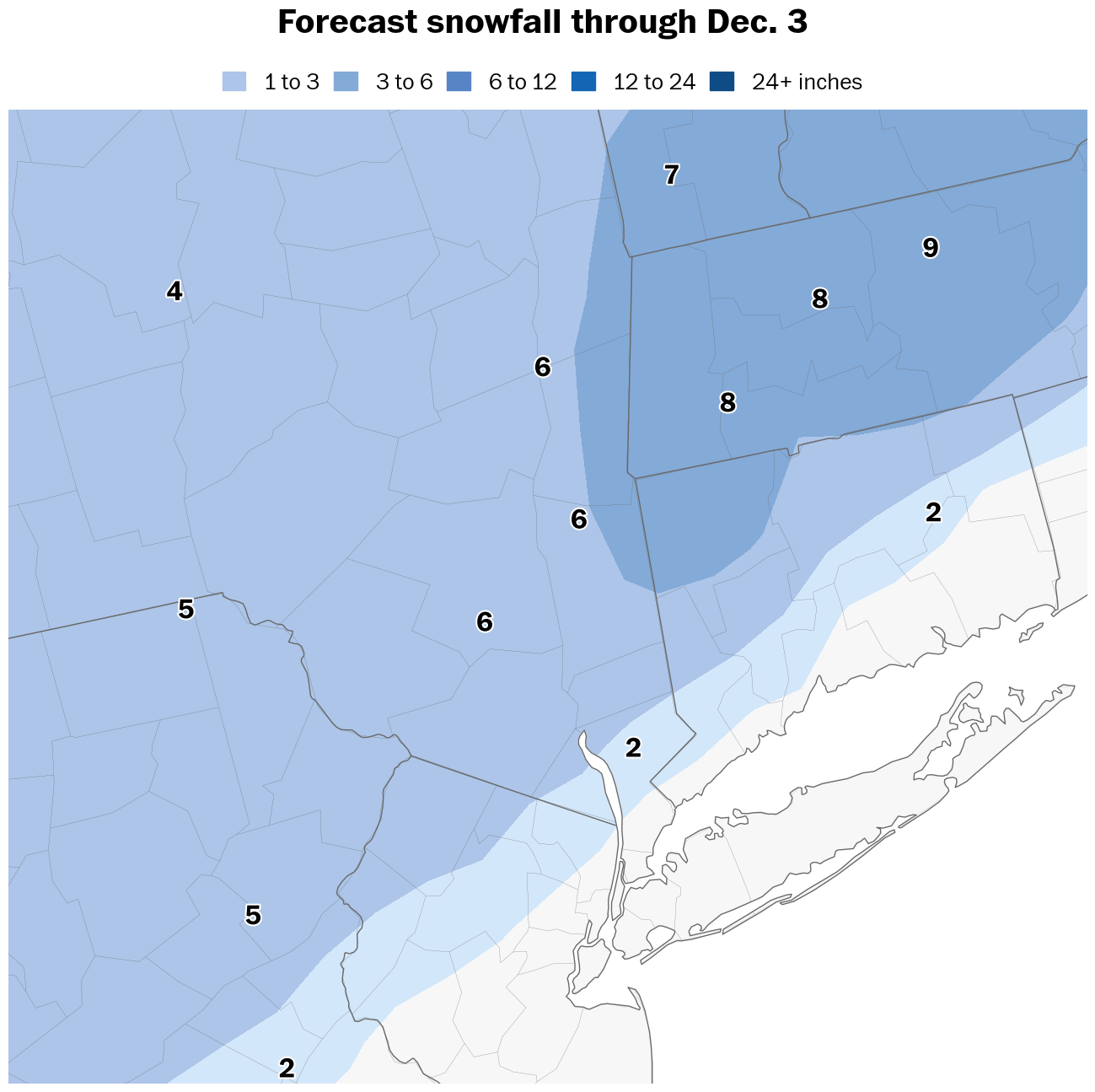 In Rockland, northern Westchester, and southern Putnam Counties, 1 to 3 inches are expected, with little or no snow south toward New York City. That’s because the rain-snow line is expected to reach these areas by Tuesday afternoon.
