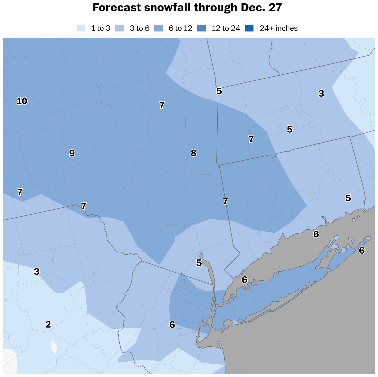 Widespread snowfall of 5 to 10 inches is expected, with localized totals potentially reaching a foot. The highest totals are expected north of I-84 and across the Catskills in Ulster County. Snow will be fluffy and pile up easily. A band of heavy snow will probably pass through the region between 6 p.m. Friday and 12 a.m. Saturday, producing snow rates in excess of an inch per hour as well as large snowflakes that are conducive to substantial accumulation.