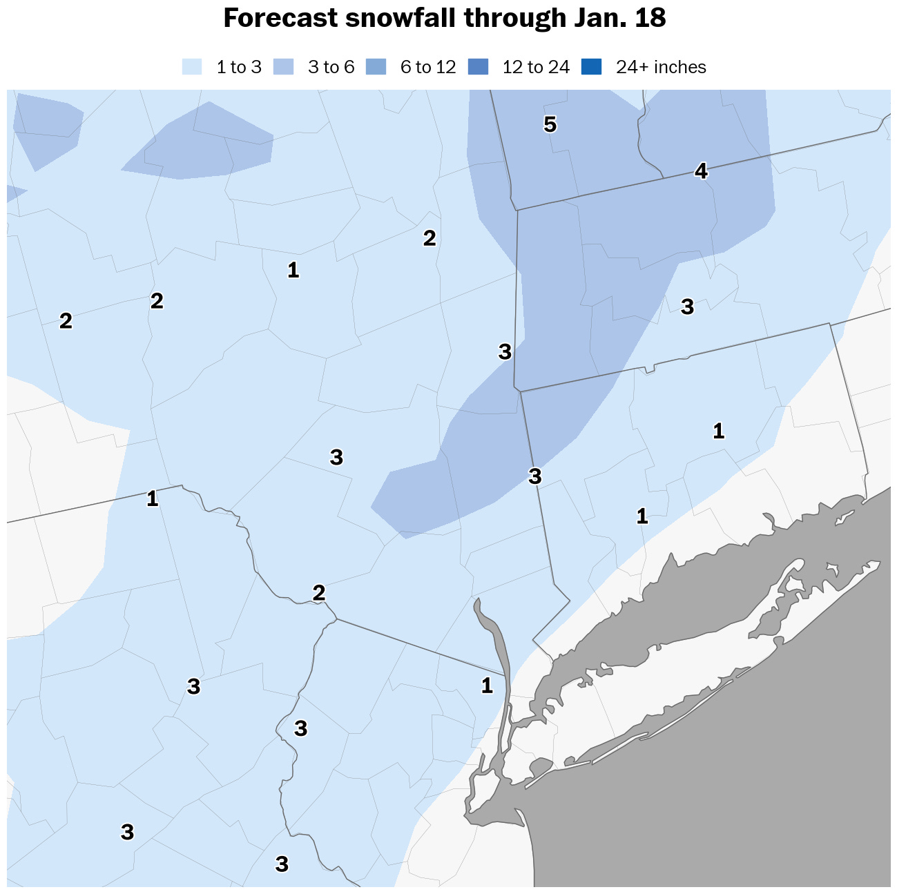 Total snowfall of 1 to 3 inches looks likely by Saturday evening, highest in hilly and elevated areas as well as north of I-84 where temperatures will be colder.
