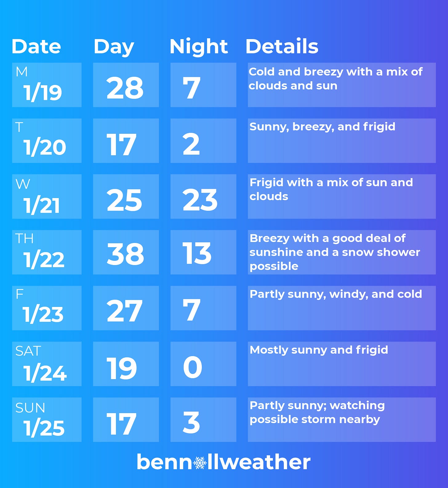 Looking ahead to the week of January 26, there’s a heightened risk for a coastal storm as frigid conditions continue.