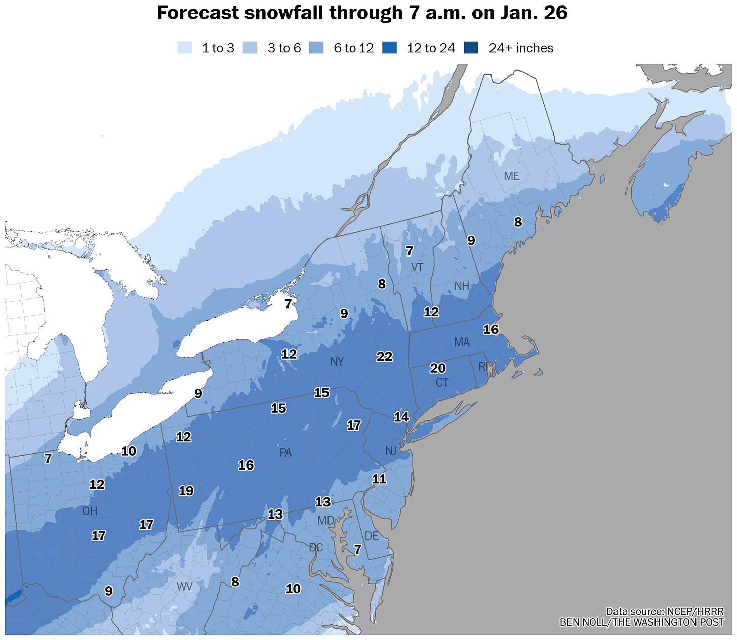 I’m expecting one to two feet across the region. There will be a ton of snow, but it will be light and relatively easy to move around — but it won’t be possible to make a snowman!