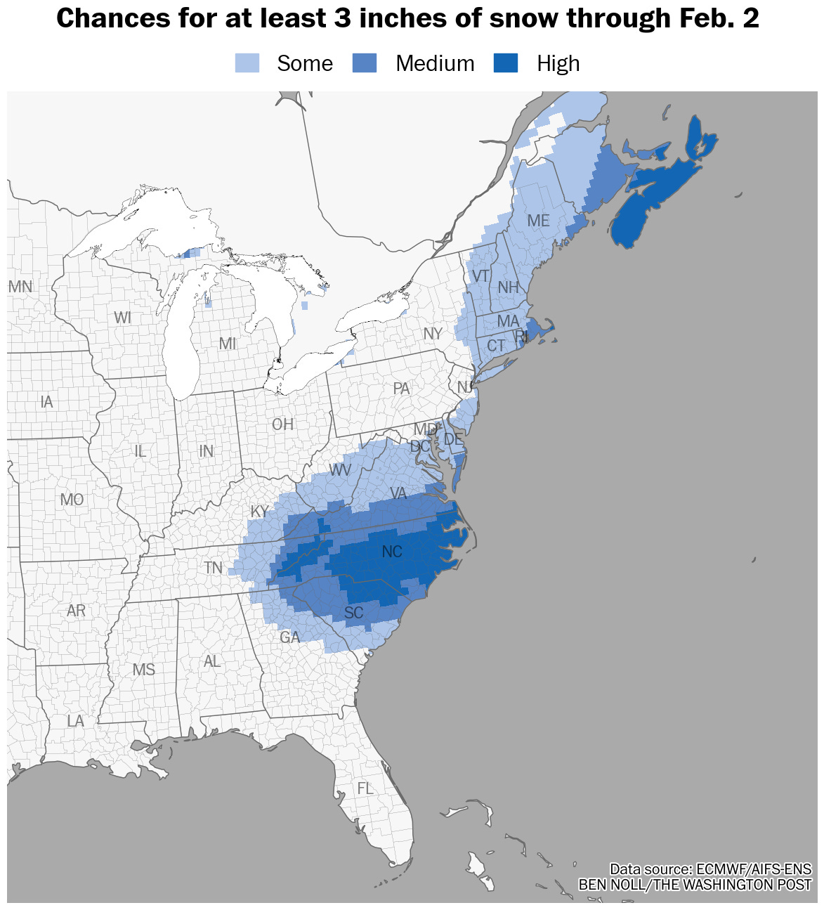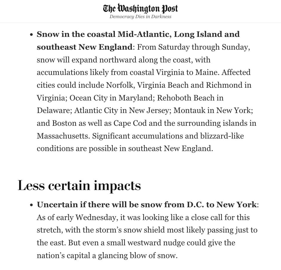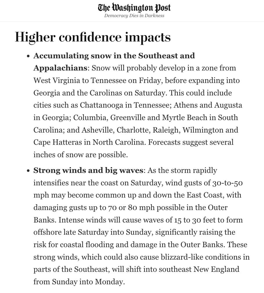 The big snow winner will be… the Carolinas! And southeast New England, including Cape Cod and the surrounding islands in Massachusetts — and perhaps Montauk on Long Island.
