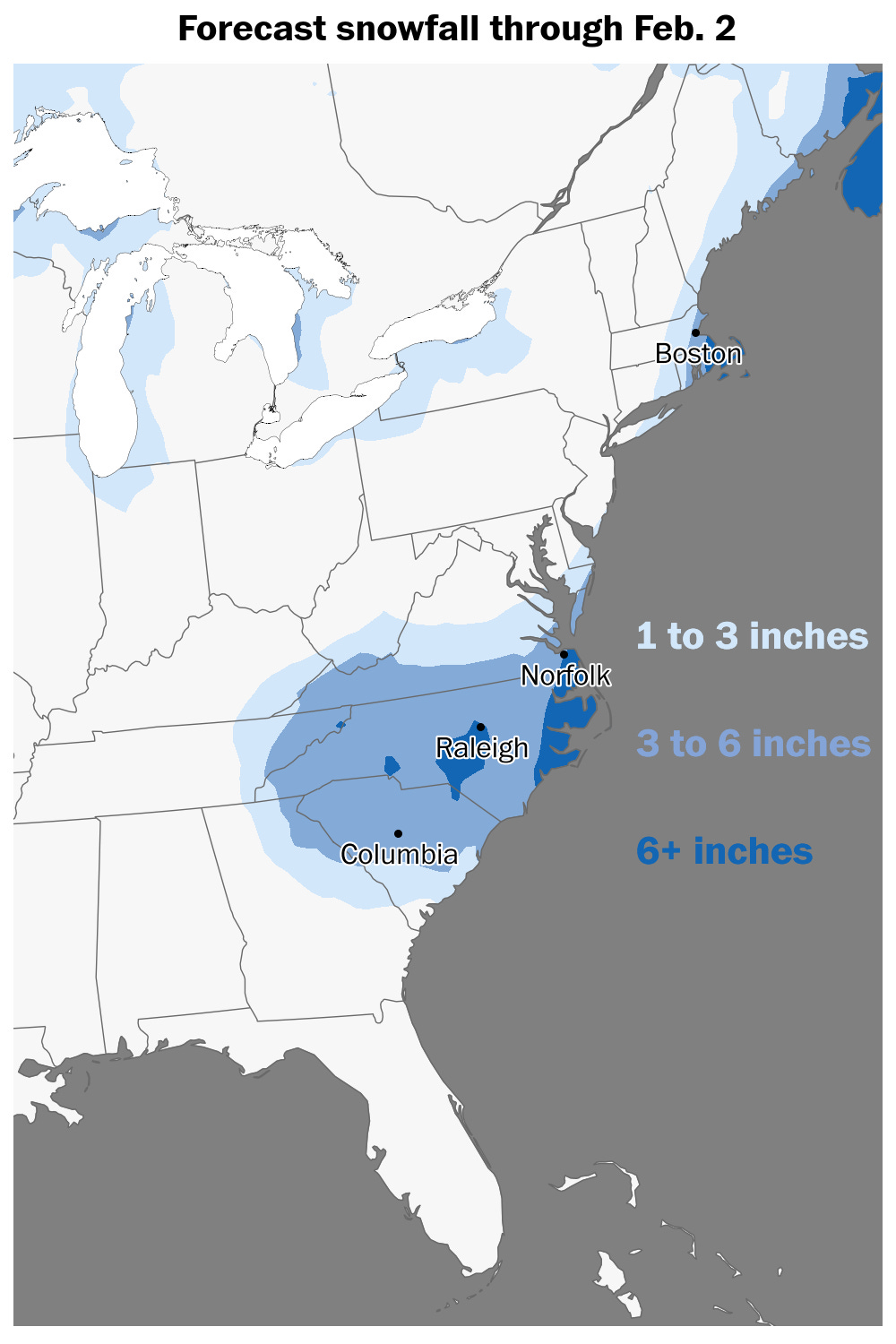 After burying the Carolinas and parts of eastern Georgia from Saturday into Sunday, the rapidly strengthening storm will pass offshore. Its snow will stretch into New England, with blizzard conditions possible in Cape Cod, and its western fringe could graze New York City and/or Long Island on Sunday.