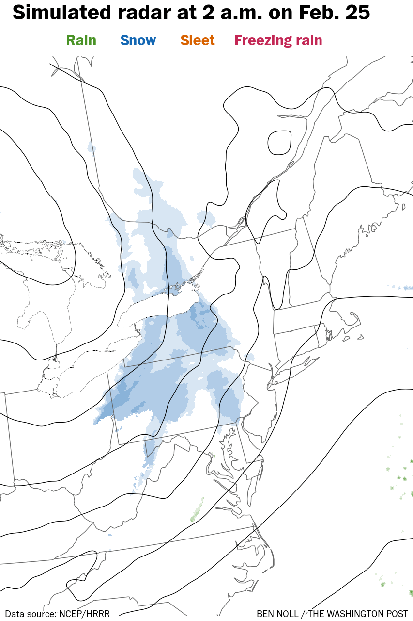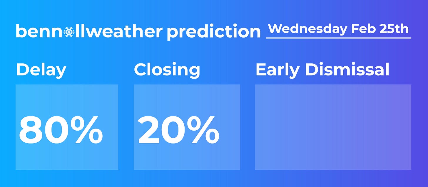 Snow will fall at a decent clip for few hours — perhaps reaching a half inch per hour — covering roads and sidewalks. Temperatures will be in the teens or 20s, so it should have no trouble sticking. Because of the timing, school delays are very likely. Three hour delays may be necessary.