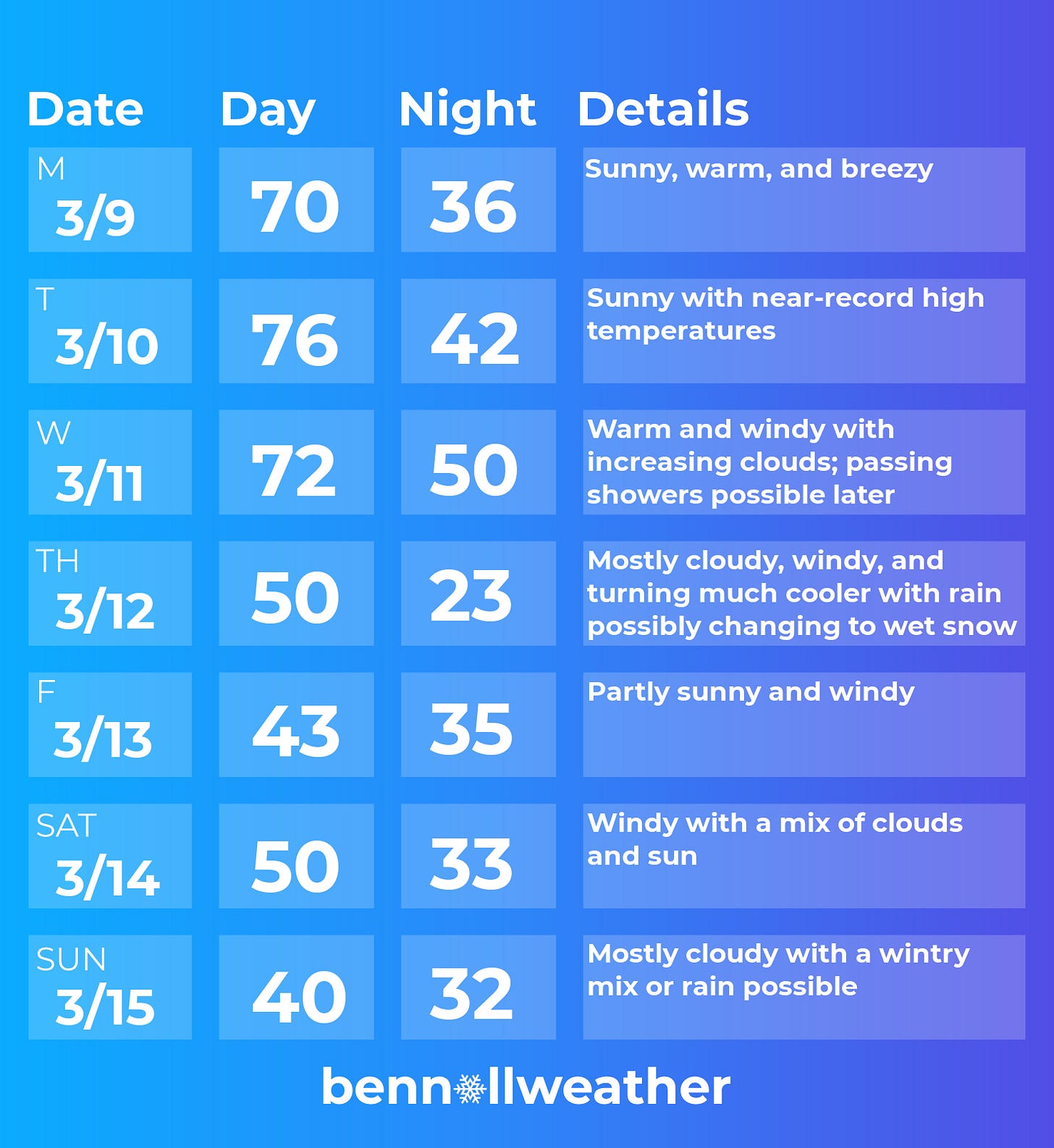 The week ahead typifies March, with temperatures swinging around 50 degrees from the 70s to the 20s and blustery conditions.